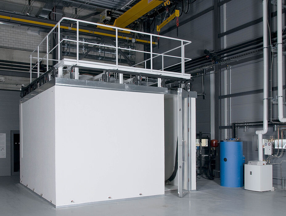 Der Prüfraum (siehe oben) ist ein in seinen Innenabmessungen (Länge 4m ±0,02m, Breite 4m ±0,02m, Höhe 3m ±0,02m) präzise festgelegter Baukörper. Seine Innenflächen bestehen aus einzelnen (je Wand vier) von Wasser durchflossenen und mit Oberflächentemperatursensoren versehenen Platten. Jede Innenfläche kann wahlweise voll oder nur teilweise beheizt bzw. gekühlt werden. Zudem ist eine mechanische Be- und Entlüftung des Raumes möglich. Die äußere Hülle des Prüfraumes besteht aus massivem Mauerwerk und Dämmmaterialien. Zusätzlich wurde zur Simulation von Außenwänden auf zwei Außenflächen je ein Kühlregister eingearbeitet.